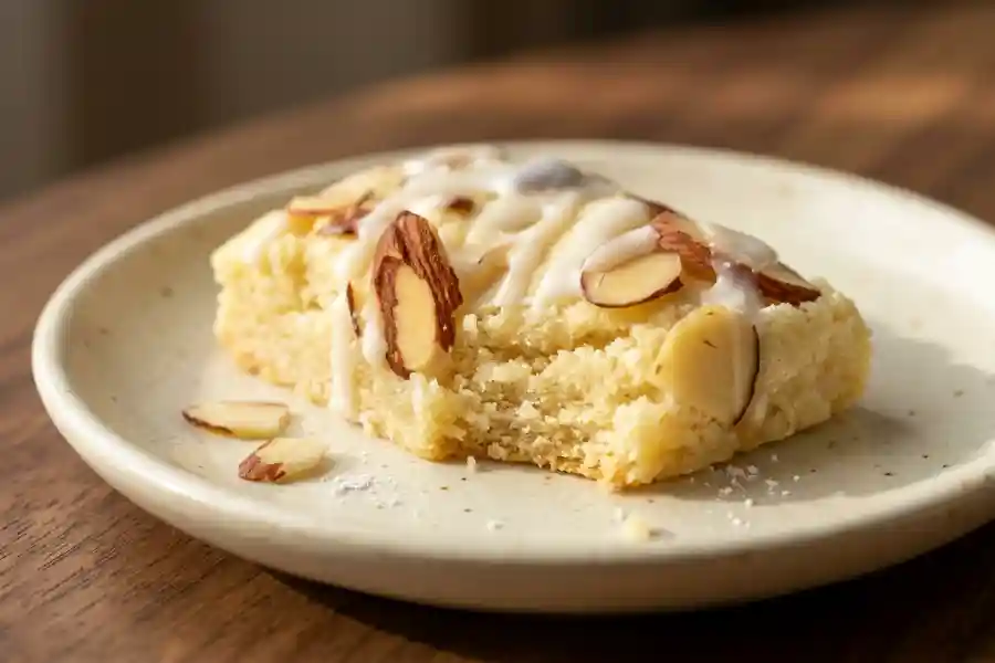 Sliced almonds on top add a delicate crunch while powdered sugar creates a soft, sweet finish. The overall taste is balanced, lightly sweet, and comforting.