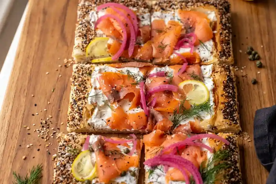 Add scrambled eggs to the cream cheese mixture before spreading it on the pastry. This creates a heartier breakfast style tart that pairs beautifully with the salmon topping.